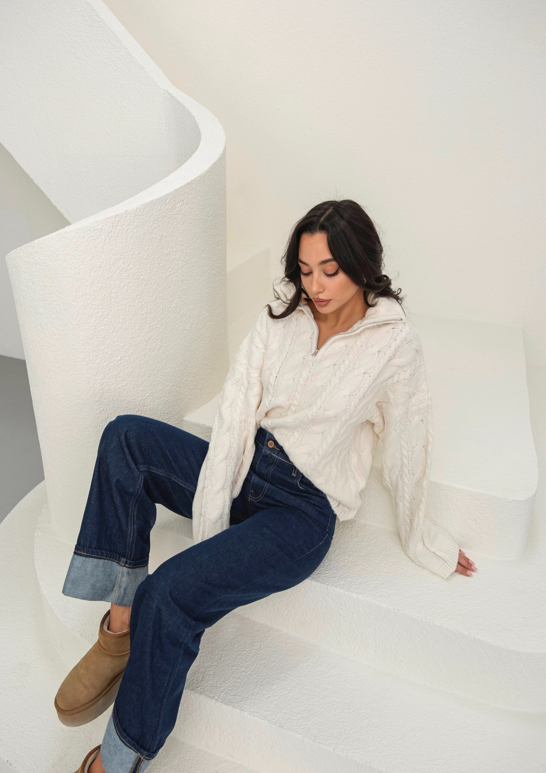 Kapsül Gardırop Saç Örgü Yarım Fermuarlı Kazak – Ekru