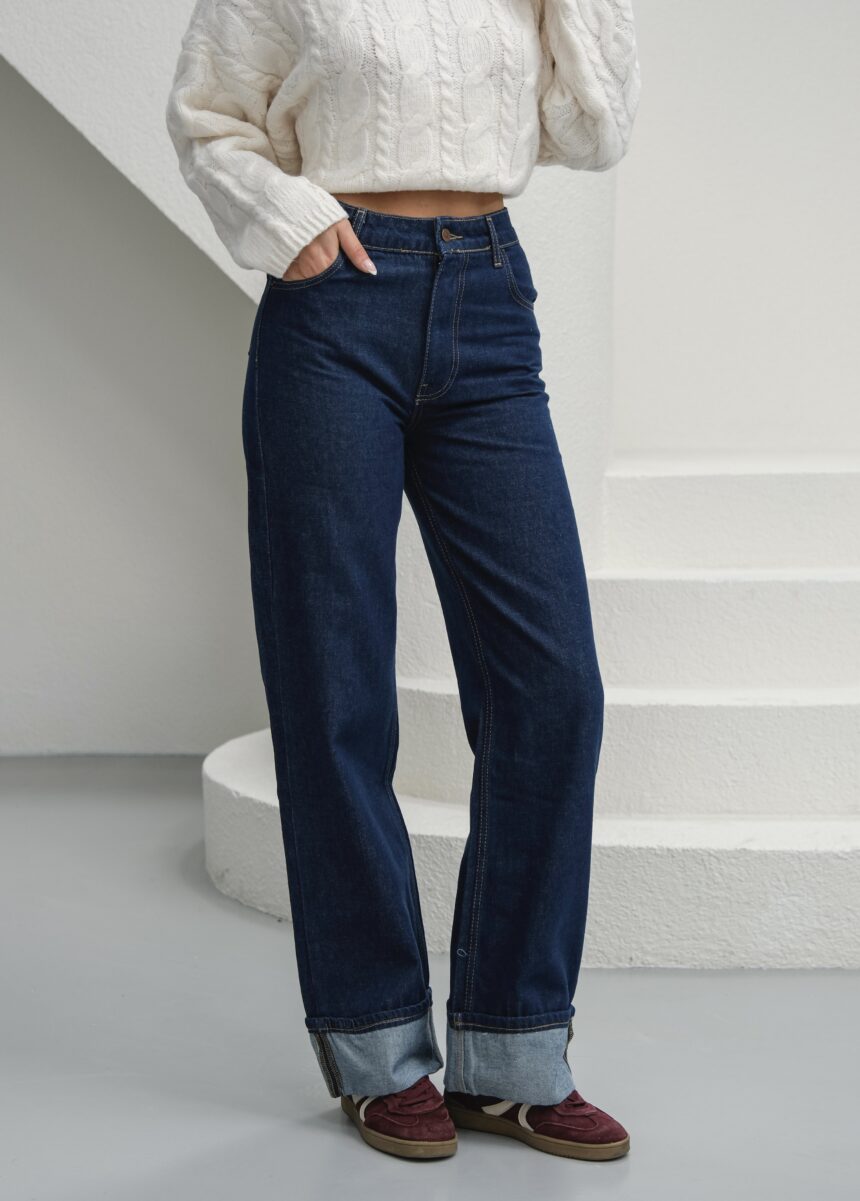 Kapsül Gardırop Koyu Mavi Paça Katlamalı Jean Pantolon