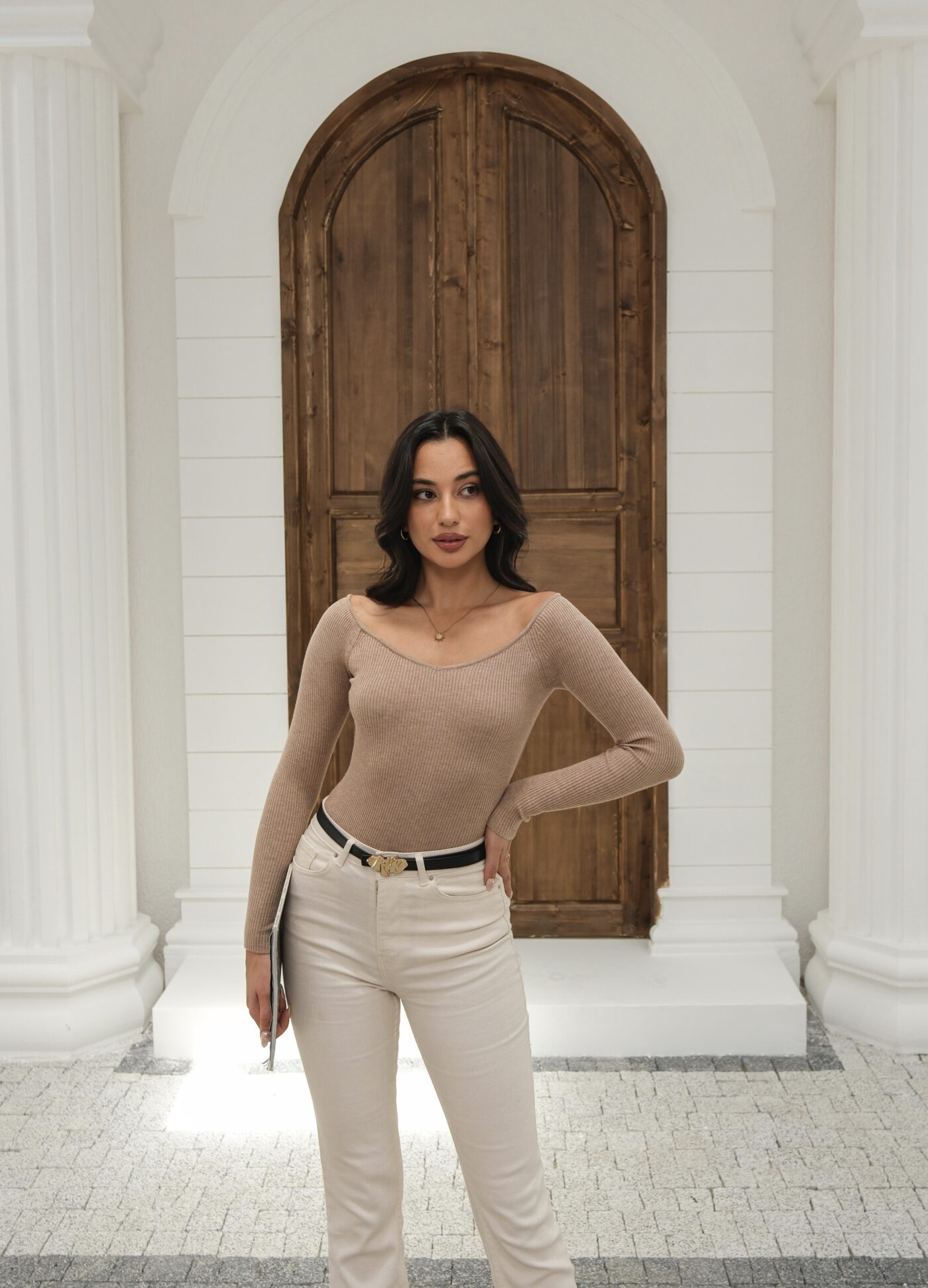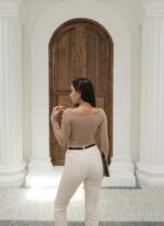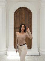 Kapsül Gardırop Geniş V Yaka Fitilli Kazak – Camel