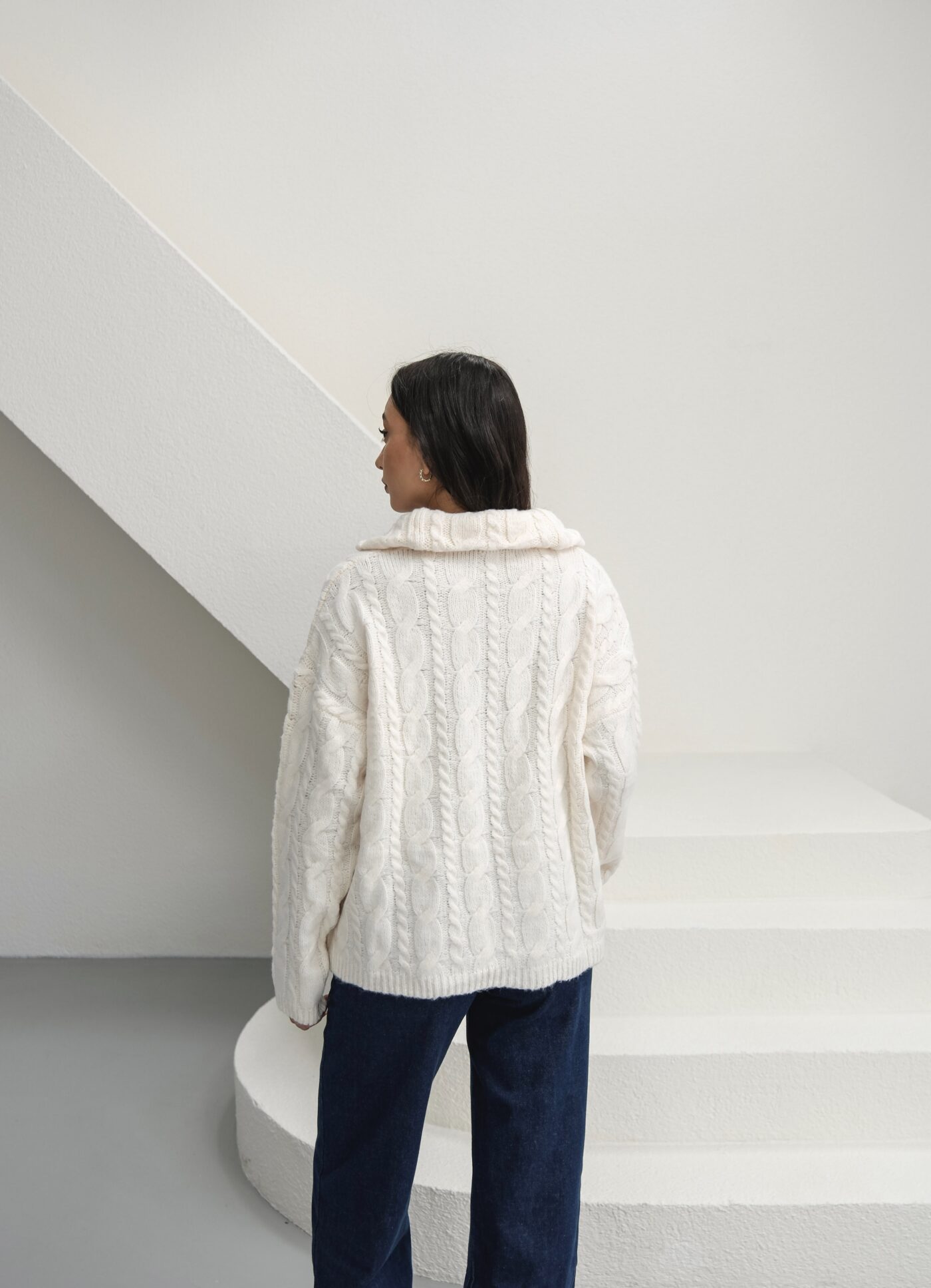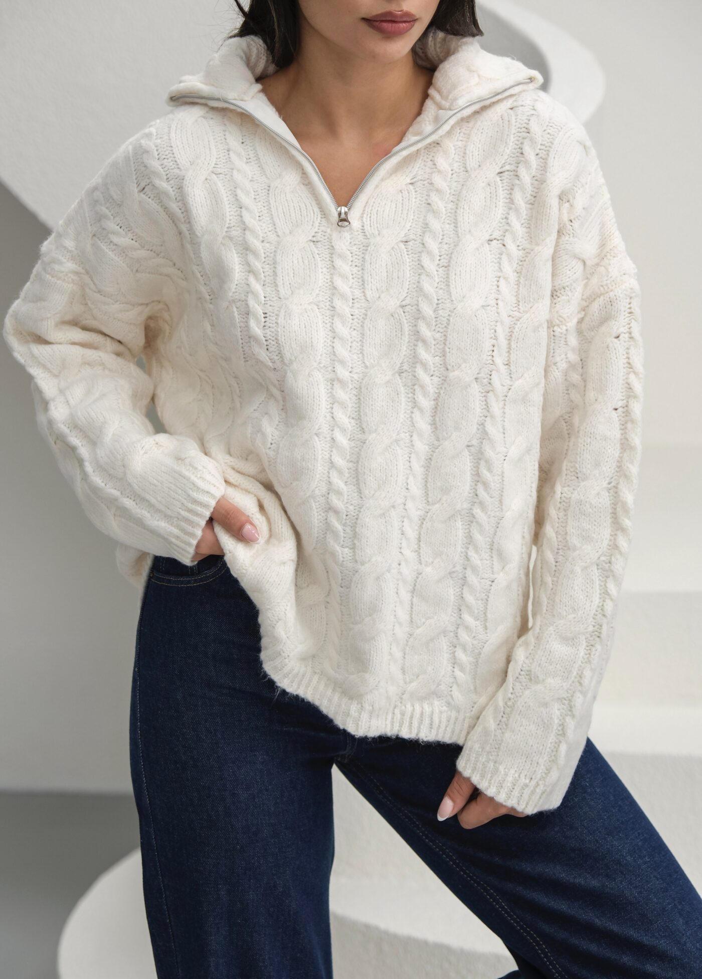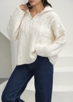 Kapsül Gardırop Saç Örgü Yarım Fermuarlı Kazak – Ekru