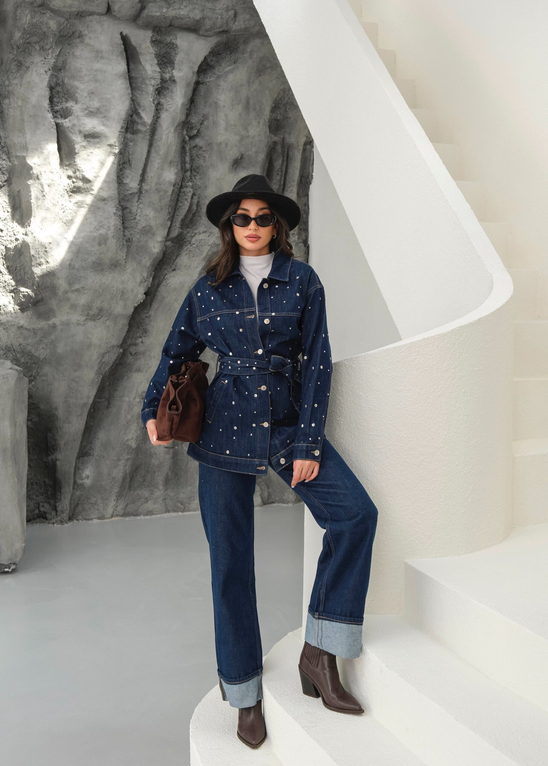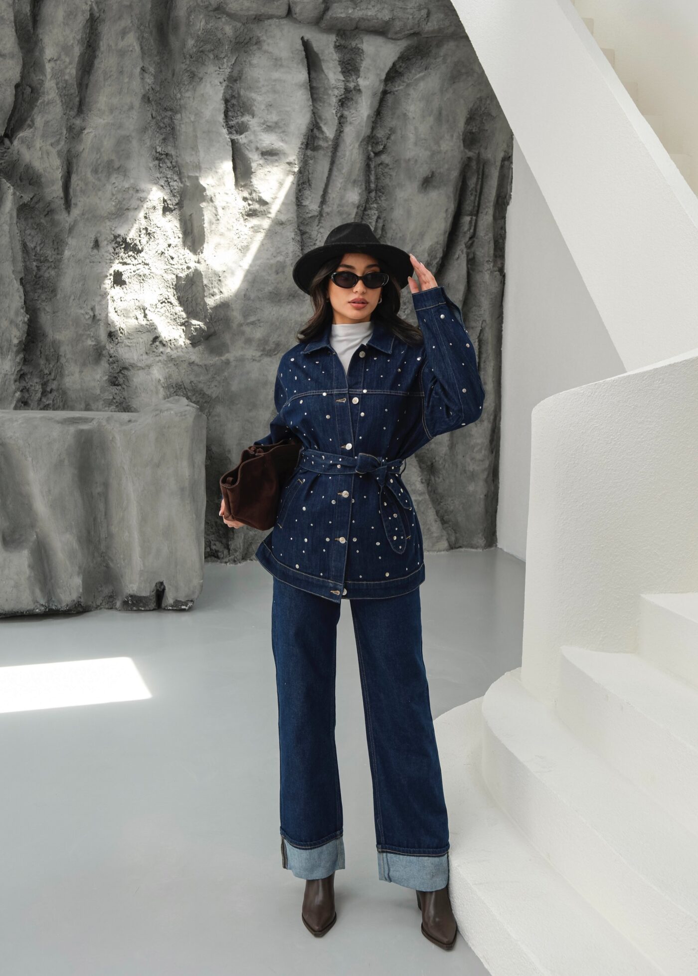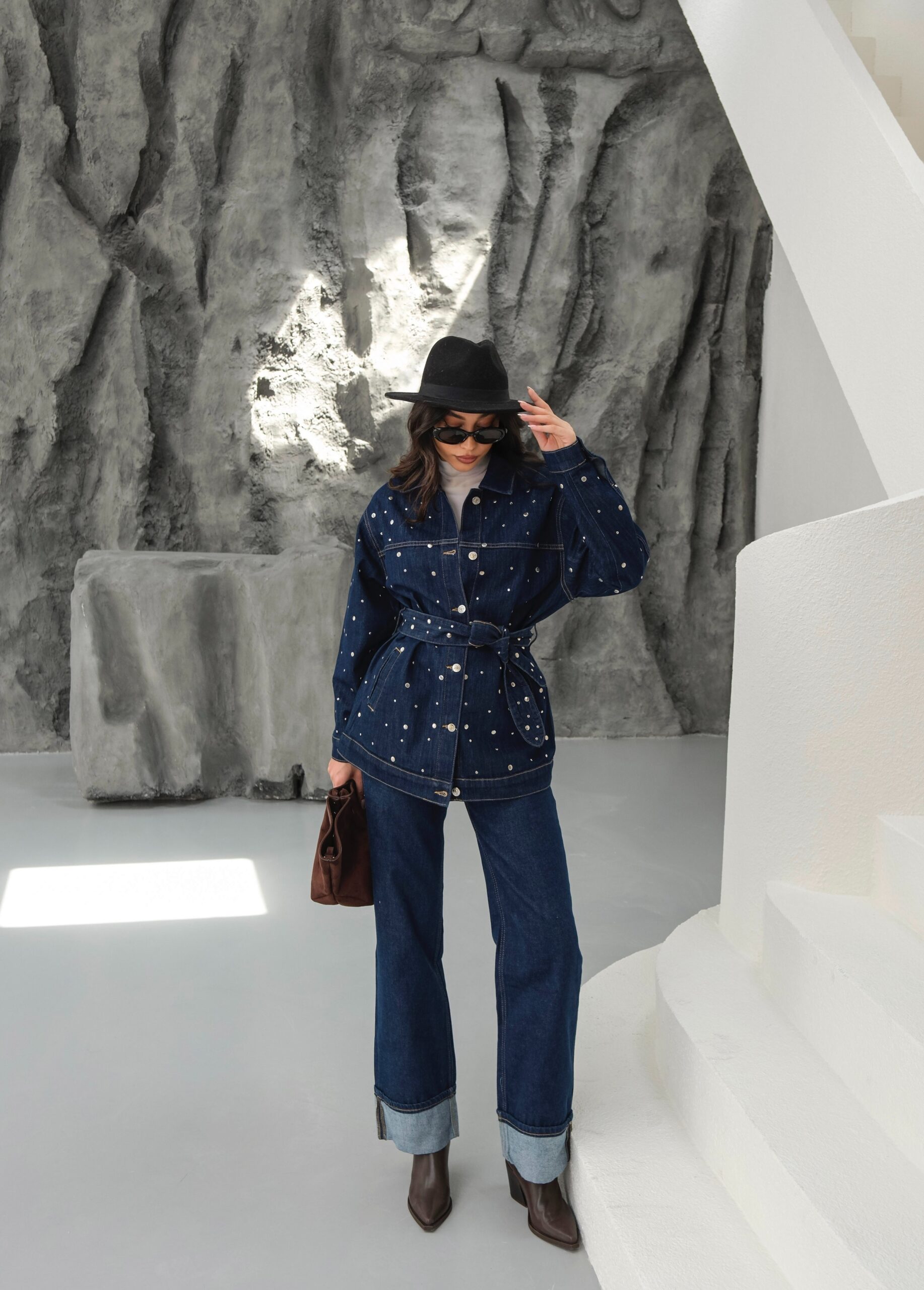 Kapsül Gardırop Koyu Mavi Metal Zımba Detaylı Kuşaklı Kot Ceket