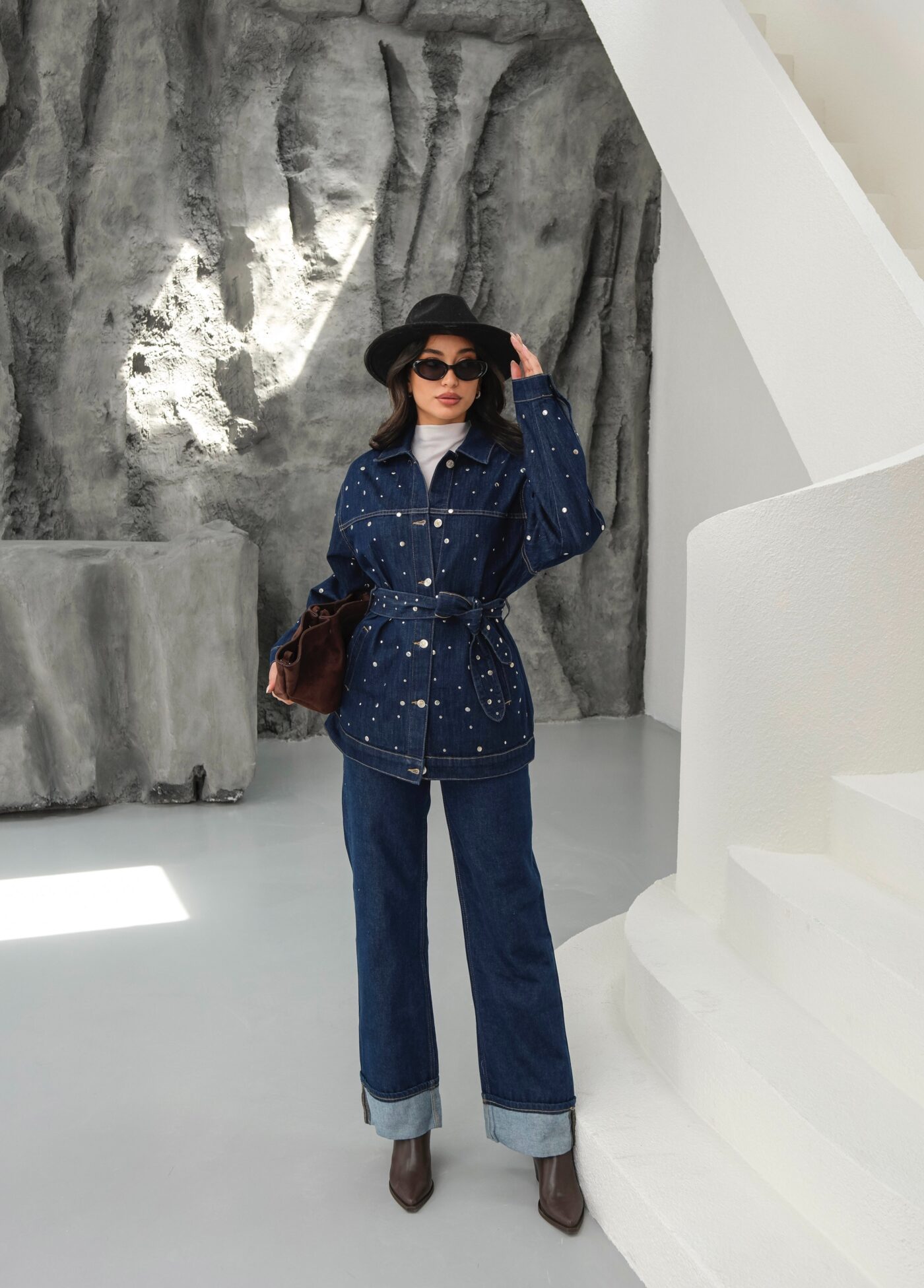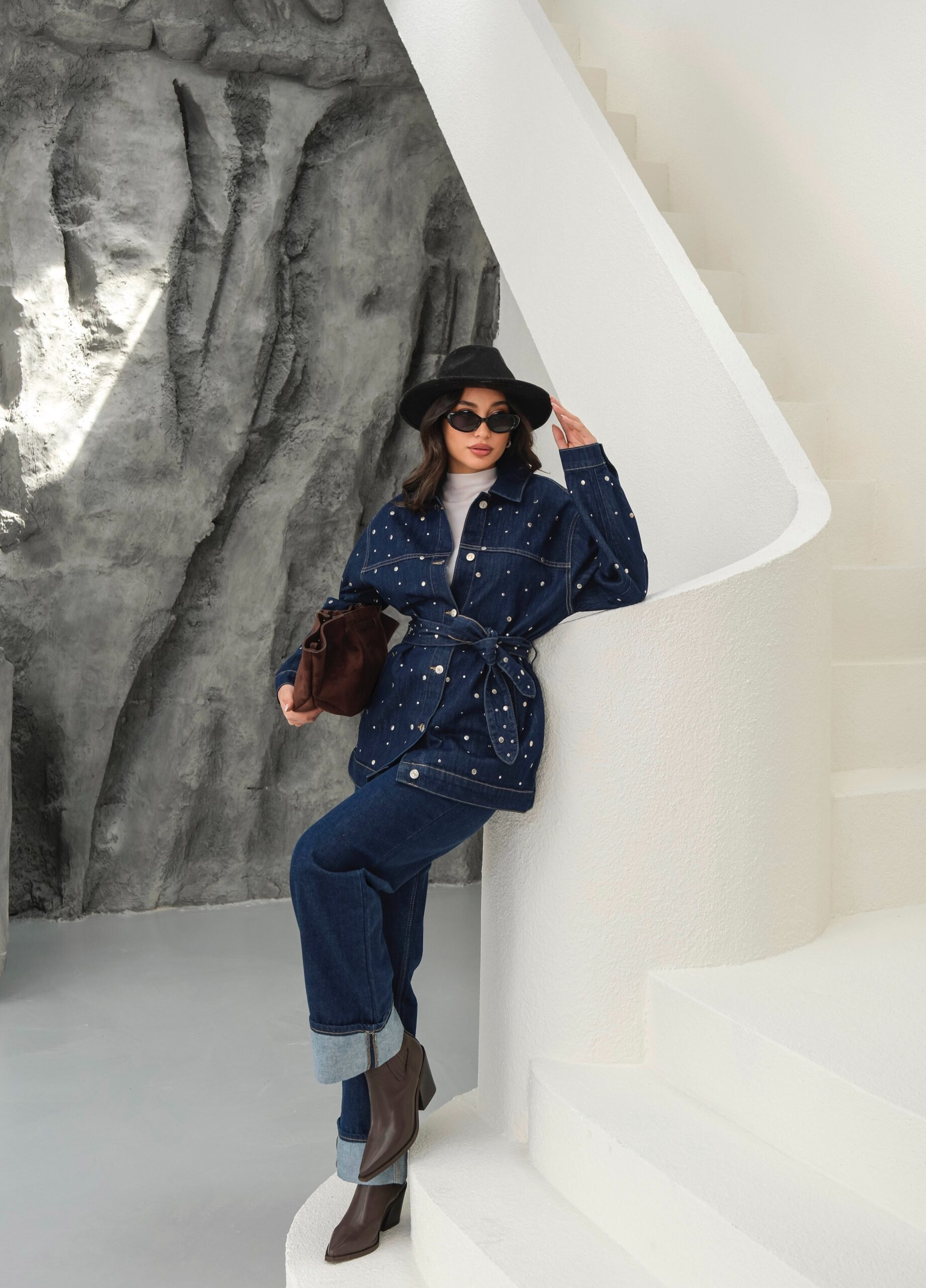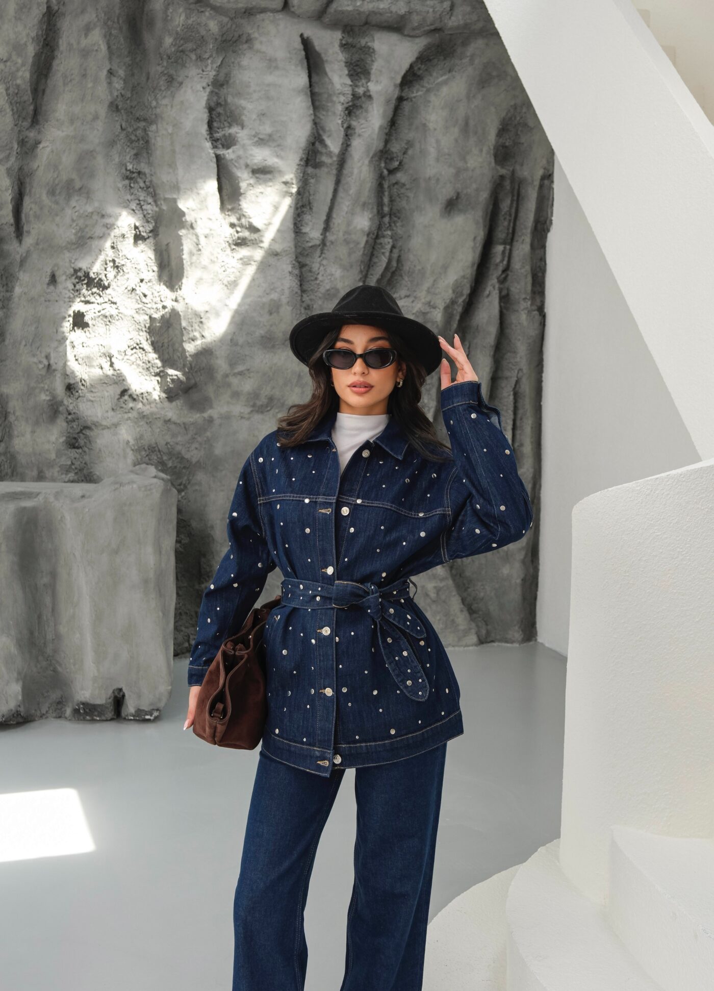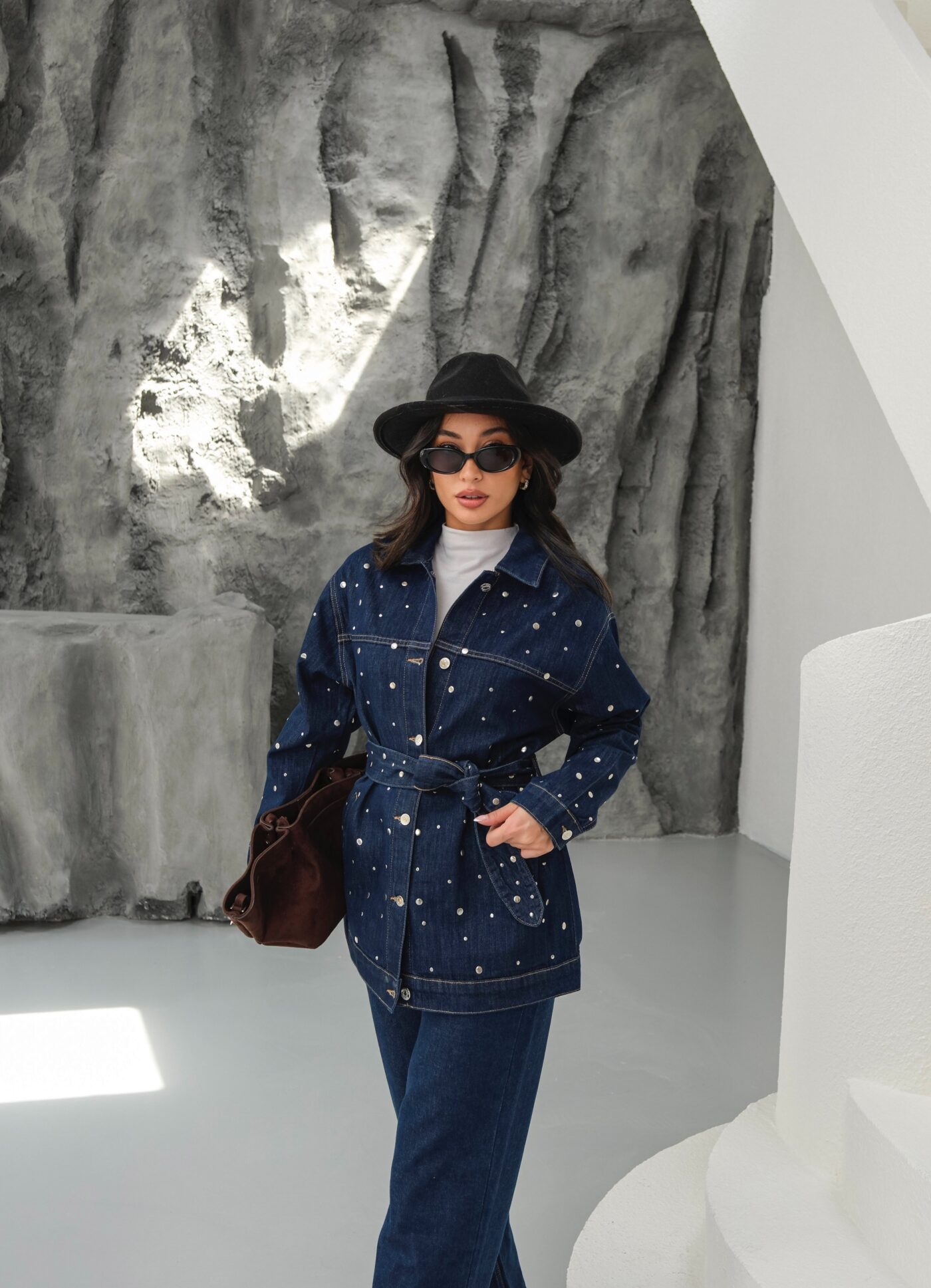 Kapsül Gardırop Koyu Mavi Metal Zımba Detaylı Kuşaklı Kot Ceket